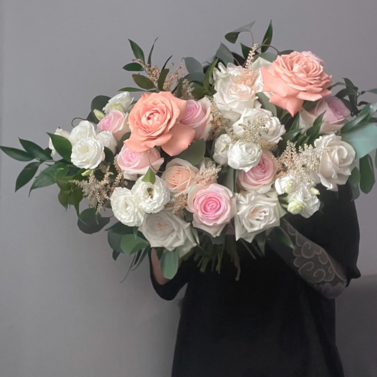 A timeless, softly-romantic bouquet that flatters any gown. Built with blush and ivory garden roses, peach focal roses, delicate lisianthus, and feathery champagne astilbe, framed with fresh greenery for airy movement. Elegant, feminine, and photo-ready.