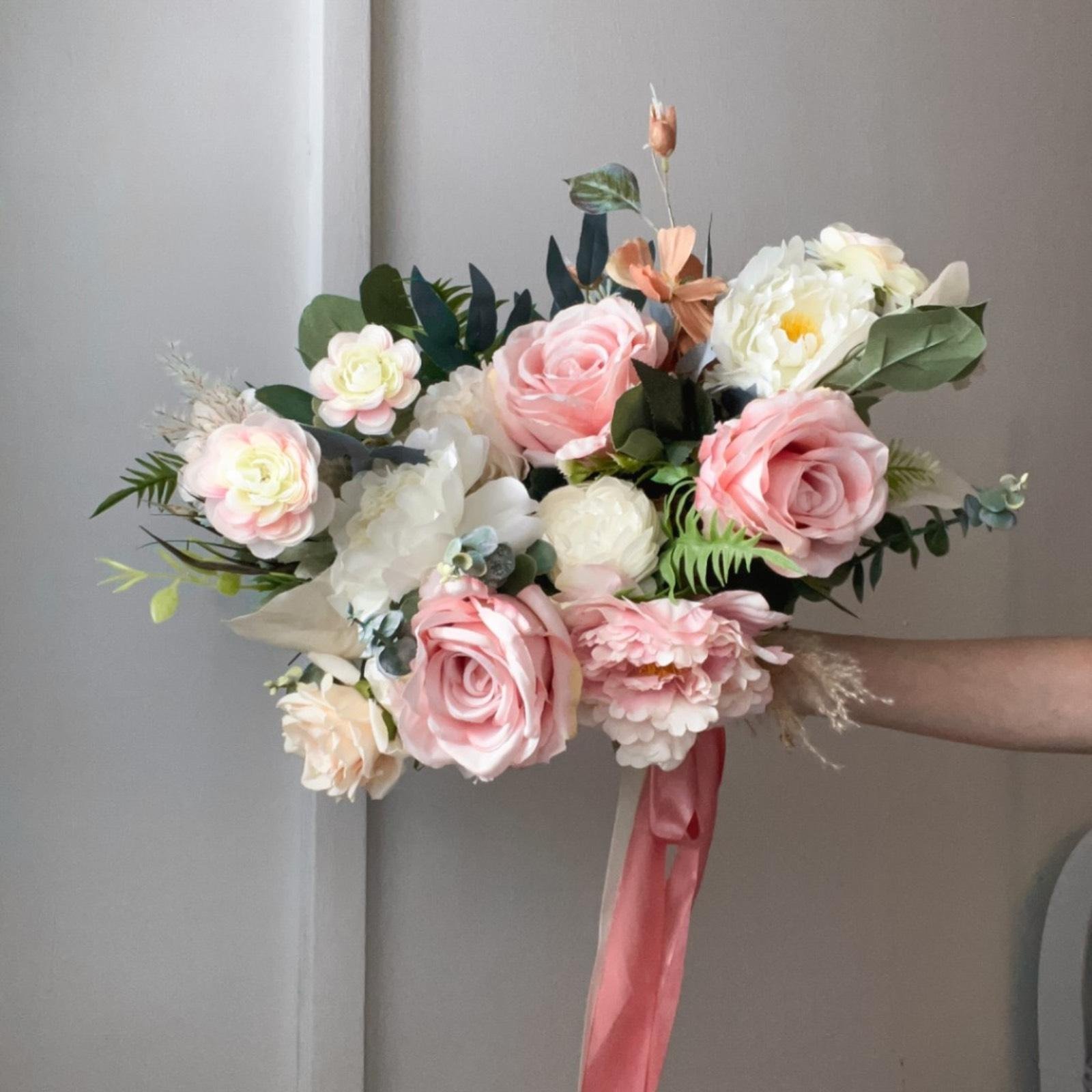 Want a different colour palette or matching bridesmaids’ faux posies? We can customise or advise on available rental sets. → Take the Bouquet Quiz