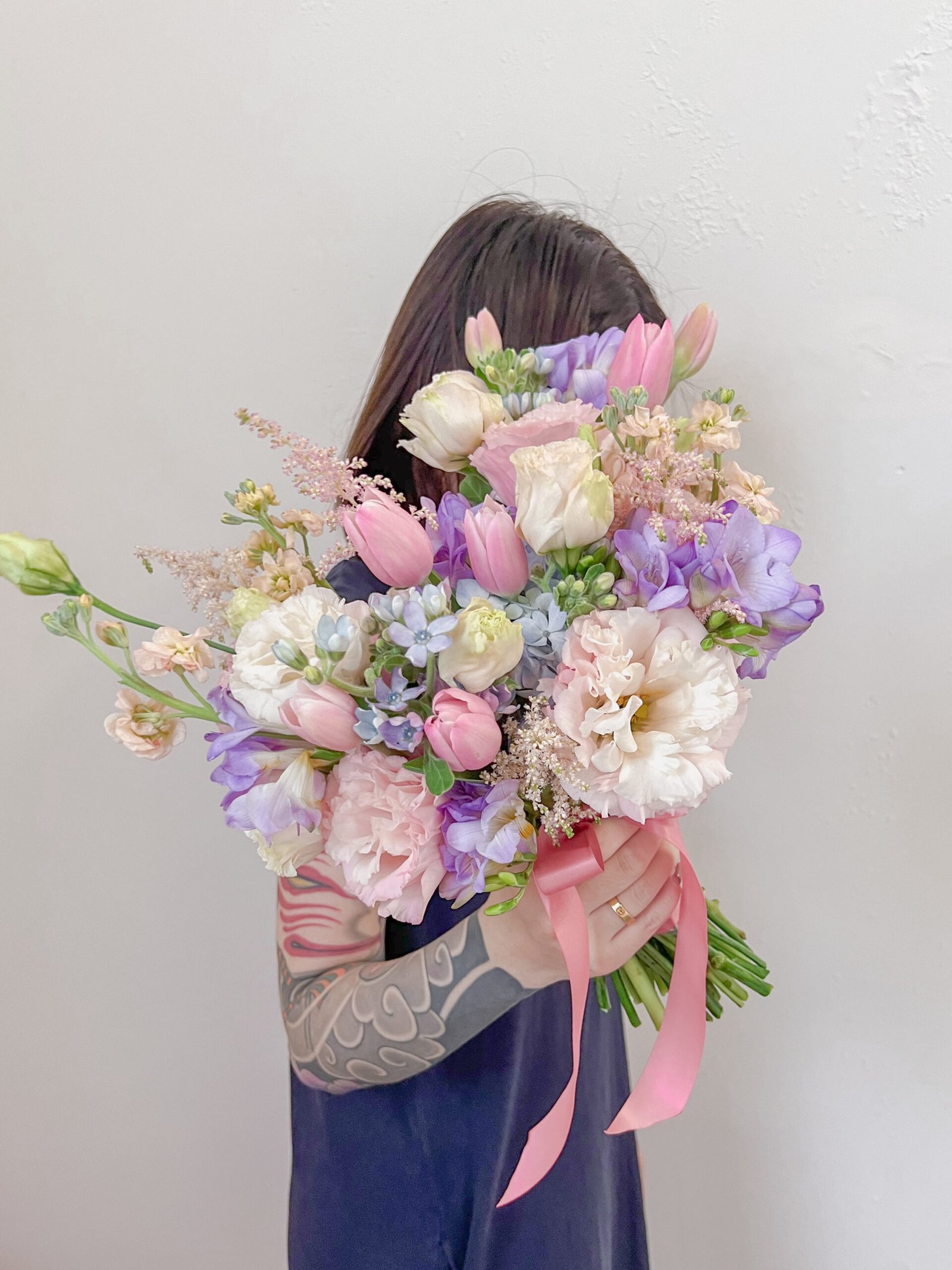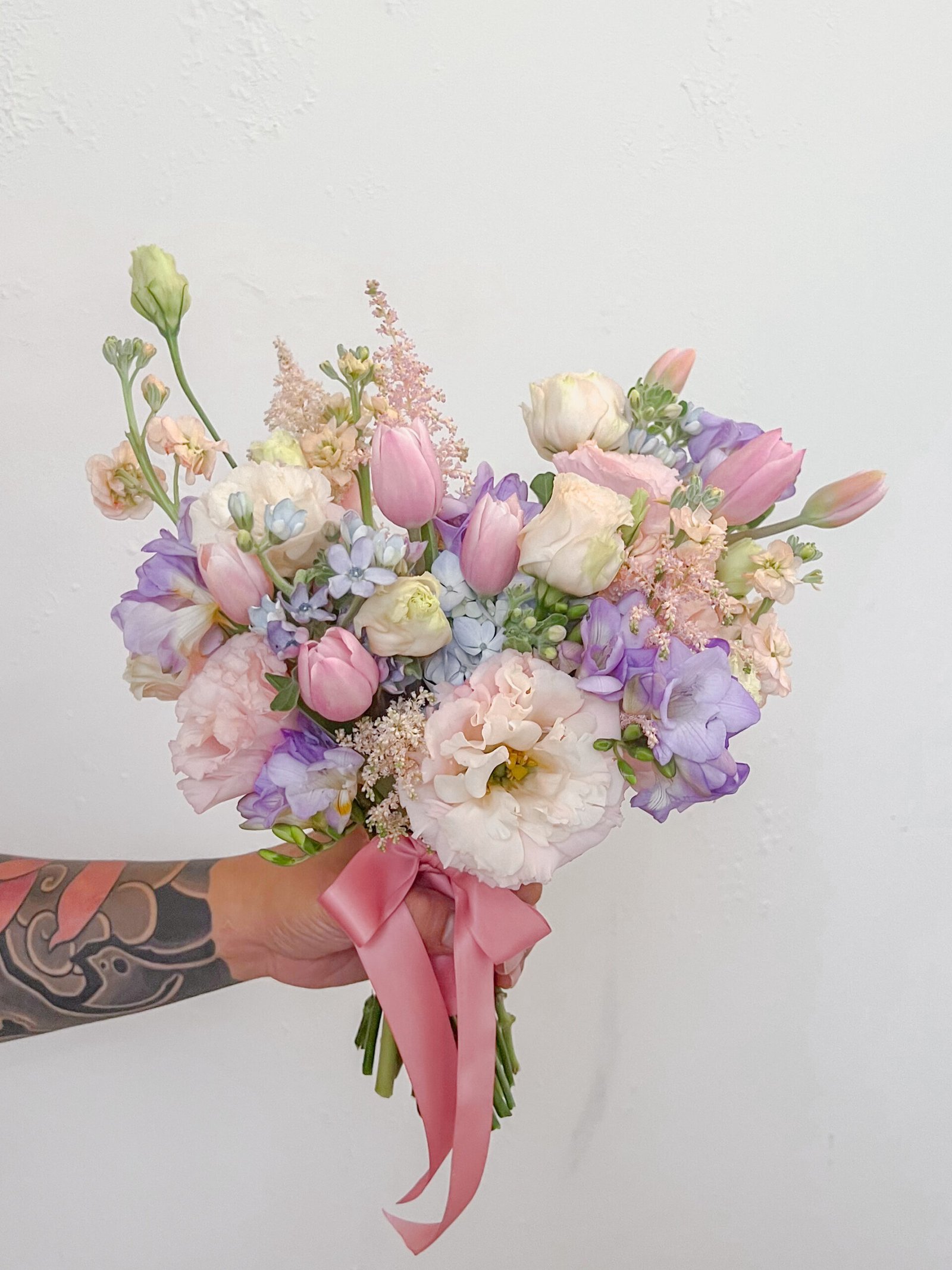 Pastel pink & lilac bouquet with tulips, peonies, lisianthus, freesias and seasonal filler florals.