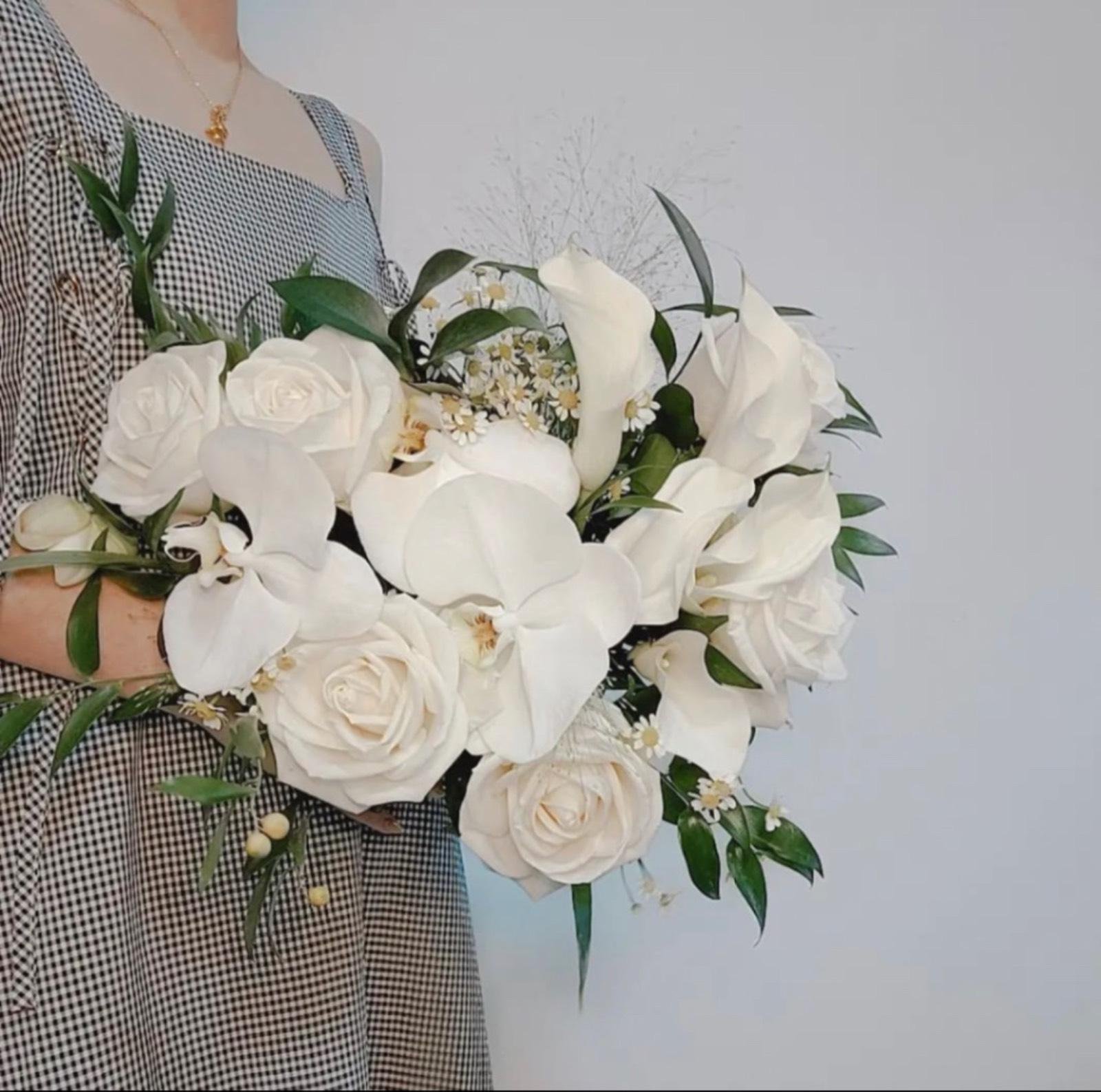 A refined, modern bouquet in soft ivory and blush. Built around a cluster of phalaenopsis orchids and sculptural calla lilies, with blush/ivory roses, lisianthus, petite daisy accents, airy filler and fresh greenery for movement—perfect for minimalist gowns and timeless portraits.