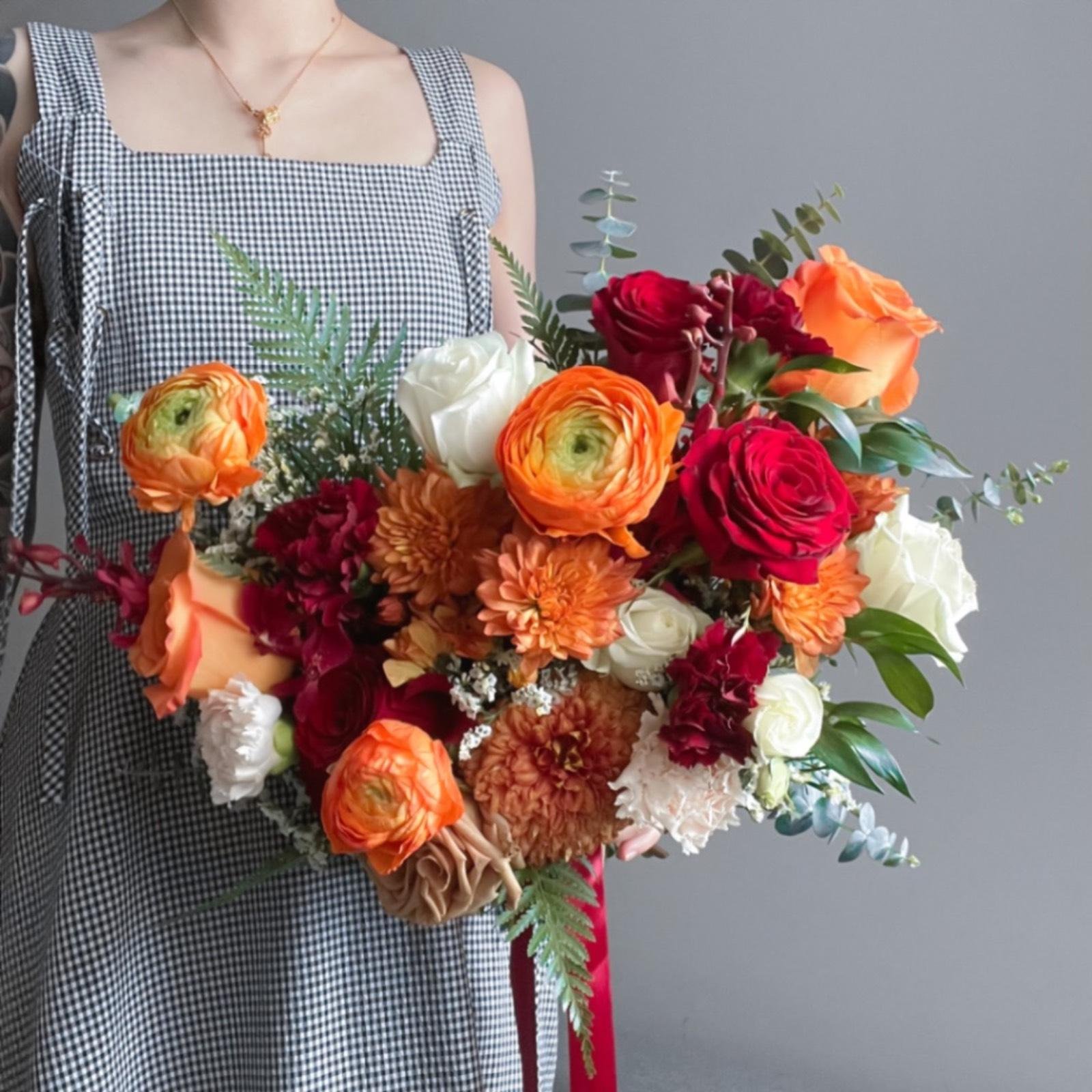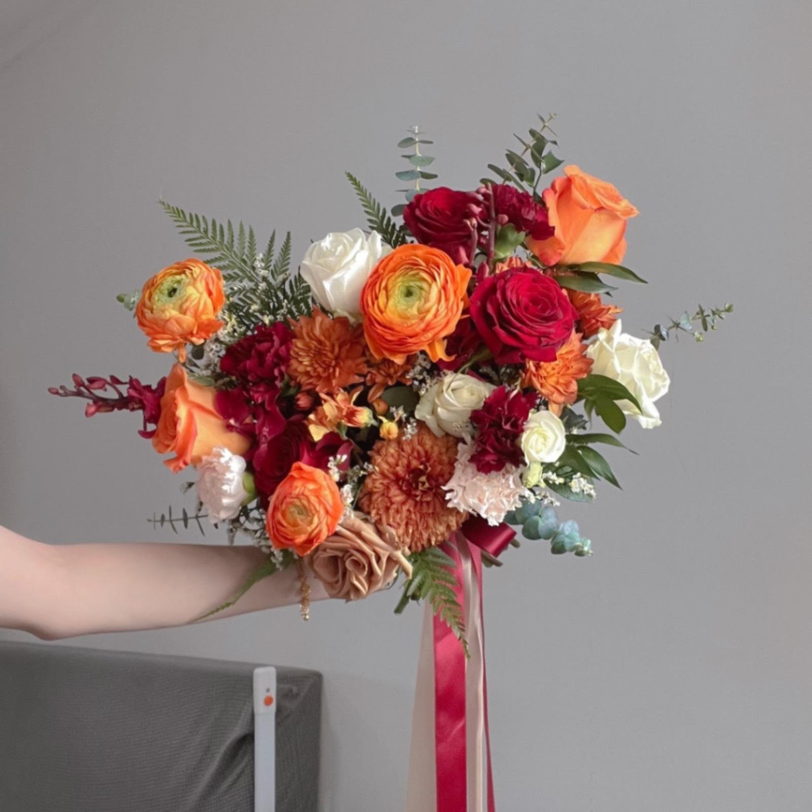 A warm, golden-hour bouquet that feels lively and romantic. Designed with tangerine ranunculus, red & peach garden roses, ivory spray roses, and textured chrysanthemums with seasonal accents (e.g., carnations, fern, eucalyptus) for depth and movement. Perfect for outdoor celebrations and modern city weddings alike.